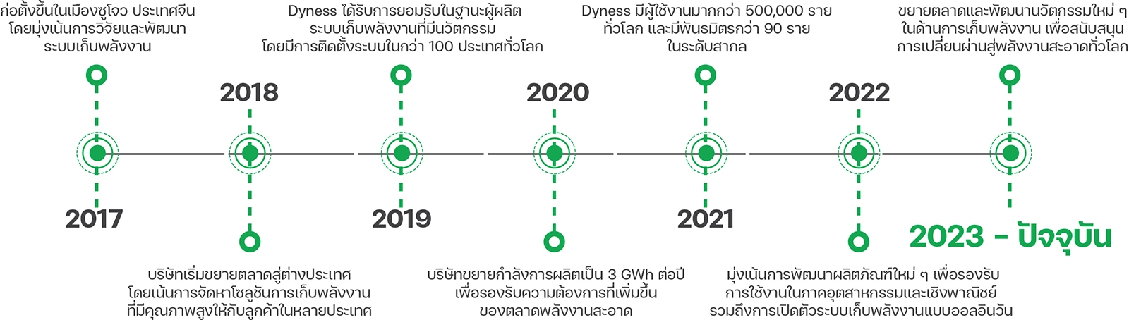 Dyness ก่อตั้งขึ้นในปี 2017 โดยเป็นผู้บุกเบิกนวัตกรรมโซลูชันการจัดเก็บพลังงานระดับโลก โดยอาศัยเทคโนโลยีอันเป็นประโยชน์และความสามารถในการวิจัยและพัฒนาผลิตภัณฑ์ที่แข็งแกร่ง Dyness ได้สร้างพอร์ตโฟลิโอผลิตภัณฑ์ที่ครอบคลุมสำหรับสถานการณ์ต่างๆ ทั้งหมด รวมถึง C&I และการจัดเก็บพลังงานในที่อยู่อาศัยตลอดทั้งวงจรชีวิต โดยมีสำนักงานใหญ่ระดับโลกในเมืองซูโจว ประเทศจีน Dyness ได้จัดหาผลิตภัณฑ์และบริการที่ปลอดภัย เชื่อถือได้ และมีคุณภาพสูงให้กับผู้ใช้มากกว่า 500,000 รายในกว่า 100 ประเทศและภูมิภาค