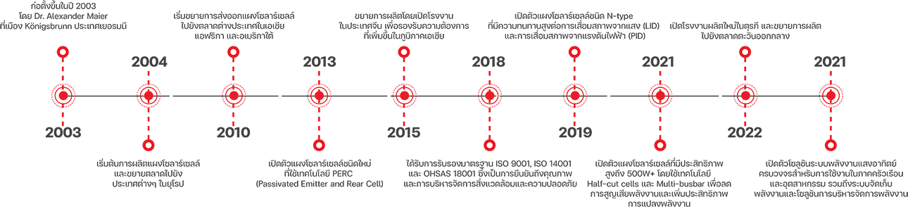 AE Solar ได้เติบโตและพัฒนาต่อเนื่องตั้งแต่การก่อตั้ง ด้วยการนำนวัตกรรมใหม่ๆ มาพัฒนาและขยายตลาดไปยังภูมิภาคต่างๆ ทั่วโลก เพื่อให้ผู้ใช้พลังงานแสงอาทิตย์สามารถเข้าถึงเทคโนโลยีที่มีคุณภาพสูงและมีประสิทธิภาพ