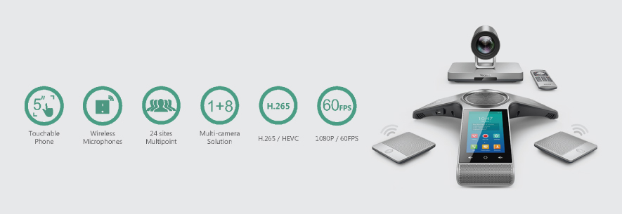 • 5-inch touchable VCS Phone with two DECT-wireless expansion microphones