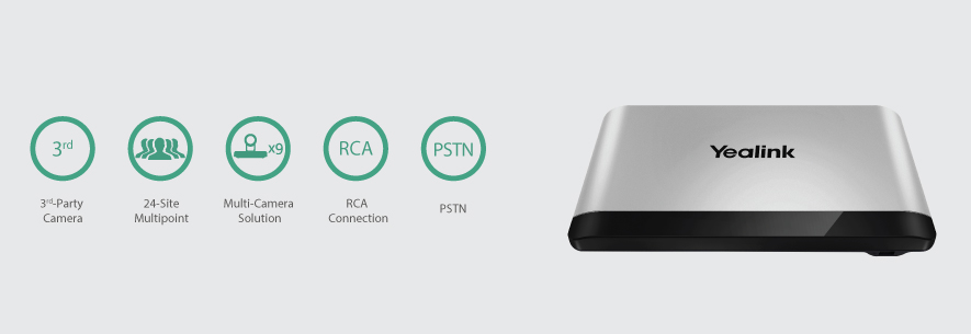 Video Conference Codec รองรับการประชุมความคมชัด Full HD 1080P นำเสนอข้อมูลการประชุมระดับ HD 1080P ถูกออกแบบมาสำหรับการใช้งานในห้องประชุมขนาดกลาง-ใหญ่ สามารถใช้งานกับกล้องเสริมผ่านช่องต่อ HDMI (Third Party) หรือใช้ร่วมกับกล้องเสริม YEALINK VCC22 ได้สูงสุด 9 กล้อง สามารถรองรับการประชุมได้ทั้งแบบ H.323, SIP รองรับการประชุมแบบ Multipoint 8/14/24 Site (Option) รองรับบันทึกการประชุม USB Memory