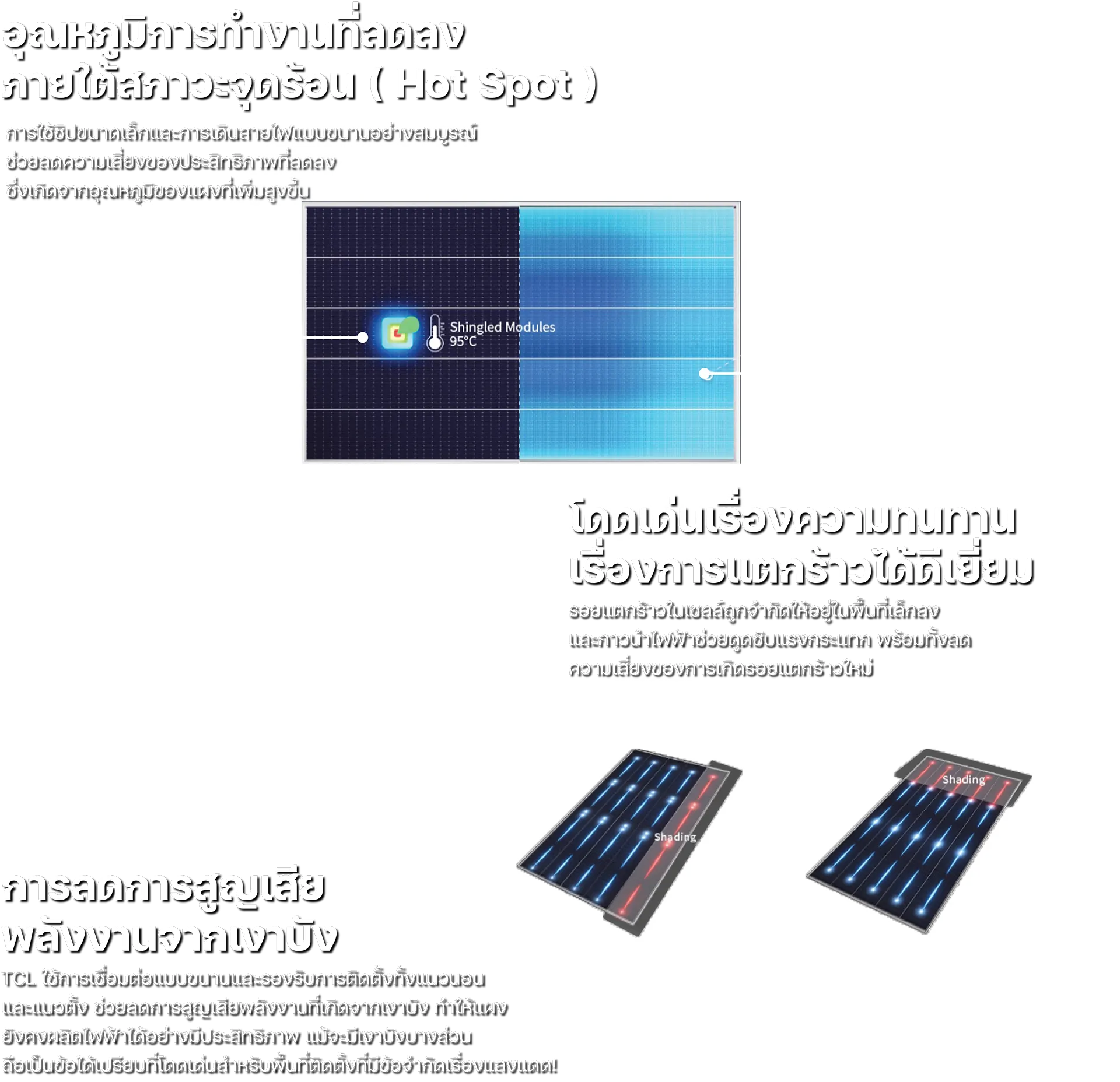 TCL ใช้การเชื่อมต่อแบบขนานและรองรับการติดตั้งทั้งแนวนอนและแนวตั้ง ช่วยลดการสูญเสียพลังงานที่เกิดจากเงาบัง ทำให้แผงยังคงผลิตไฟฟ้าได้อย่างมีประสิทธิภาพ แม้จะมีเงาบังบางส่วนถือเป็นข้อได้เปรียบที่โดดเด่นสำหรับพื้นที่ติดตั้งที่มีข้อจำกัดเรื่องแสงแดด!
