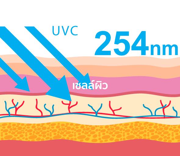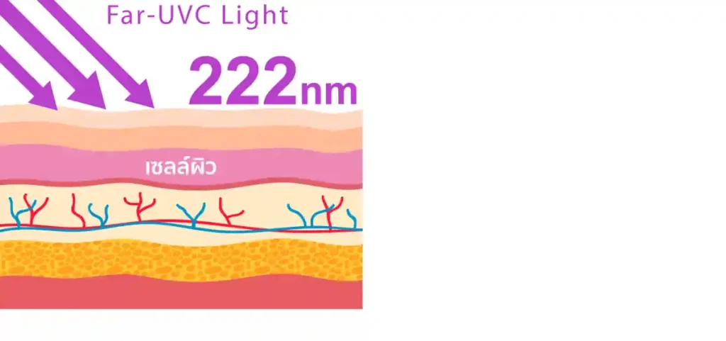 - คลื่นสั้นกว่า UV-C ทั่วไป จึงดูดซึมเพียงชั้นผิวหนังกำพร้าและกระจกตาด้านนอก ไม่ทะลุถึงเซลล์มีชีวิต