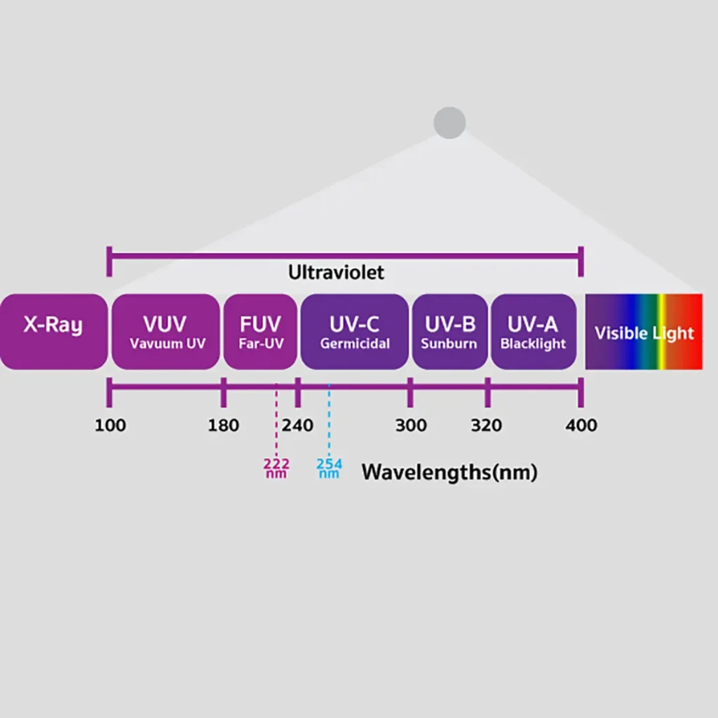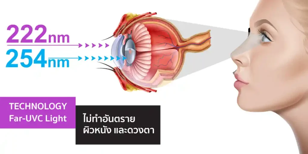 Far-UV จะอยู่ในช่วง 222 nm ไไม่สามารถมองเห็นเป็นลำแสงแสงได้ ความหมายคือ ไม่ทำลายดวงตา มนุษย์ หรือ สัตว์ และไม่ทำให้เกิดมะเร็งสามารถใช้ได้แม้ในขณะที่มีคนอยู่ ทำให้ฆ่าเชื้อในอากาศและพื้นผิวสิ่งแวดล้อมได้อย่างต่อเนื่อง
