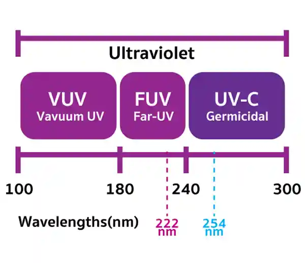 แสงอัลตราไวโอเลต (UV) ไม่สามารถมองเห็นด้วยตาของมนุษย์และแบ่งออกได้เป็นแสง UV-A, UV-B และยูวีซี UV-C แสงอัลตราไวโอเลตแบ่งตามความยาวคลื่นเป็น UV-A (320-400 nm) ให้แสงแบล็กไลต์, UV-B (280-320 nm) ก่อให้เกิดอาการผิวไหม้, และ UV-C (100-280 nm) ซึ่งมีพลังงานสูงที่สุด ใช้ทำลายสารพันธุกรรมของเชื้อโรคได้อย่างมีประสิทธิภาพ โดยช่วงคลื่น 254 nm เป็นจุดที่ทำลาย DNA/RNA ได้ดีที่สุด